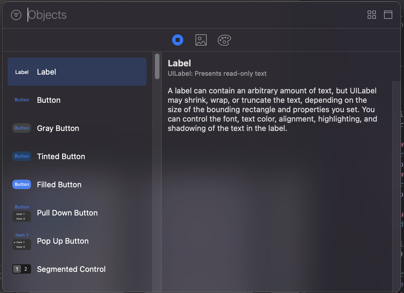 xcode 스토리 보드 파일에서 오른쪽 상단 + 버튼 또는 (command + shift + L)을 사용하면 오브젝트 라이브러리를 띄울 수 있다