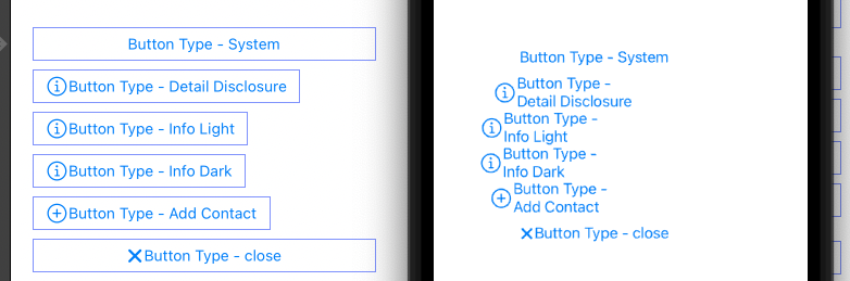 UIButton의 속성 중에 Type을 각각 Sytem(기본), Detail, Info Light, Info Dark, Add Contact, Close로 변경했다