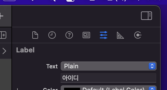 Label을 클릭 후 화면 오른쪽 inpectors 창에서 5번째 Attributes inspector 탭으로 이동한 후 Text Plain 아래 공간에 "아이디"라고 입력하면 text가 바뀐다