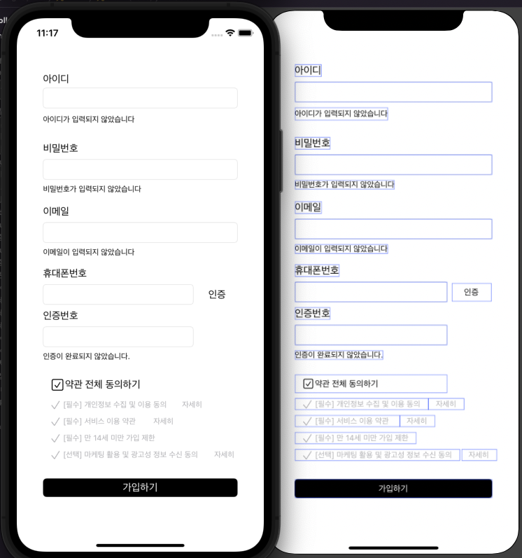 같은 방식으로 비밀번호, 이메일, 휴대폰번호, 휴대폰번호 인증번호, 친구 초대 추천인 아이디를 입력할 수 있는 Label과 Text Field를 만들자 text Field 밑에는 형식이 잘못된 경우에 알려줄 수 있는 label도 넣어주자