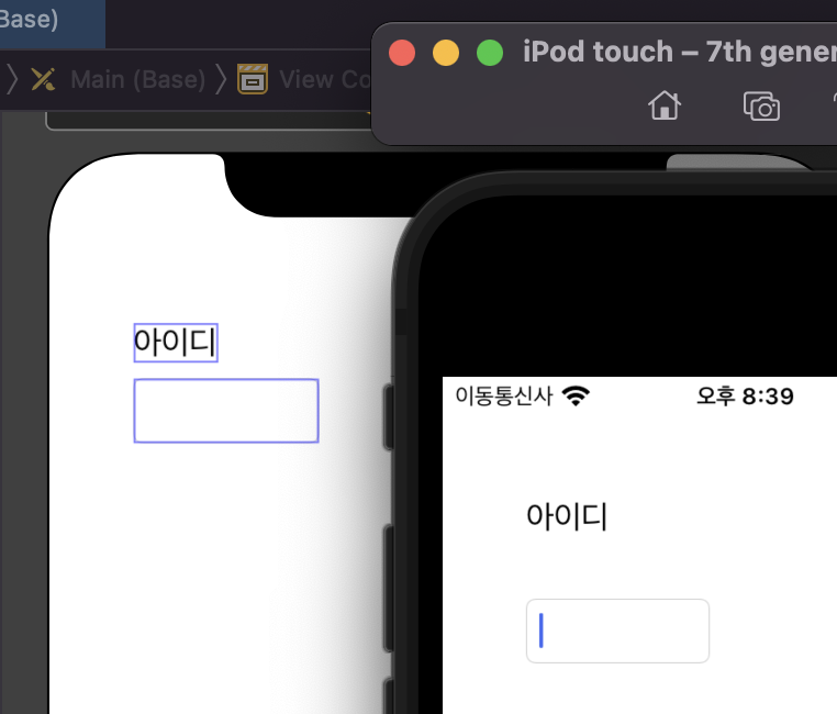 아이디 Label 밑에 Text Field를 위치시킨 후 command + R 을 눌러서 시뮬레이터를 켜보자