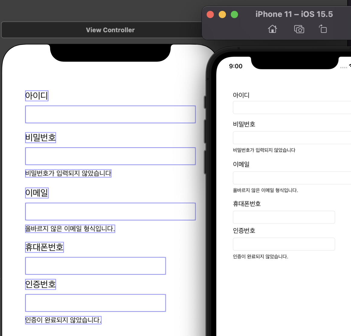 위 이미지에는 없는데 아이디 TextField아래에도 "아이디가 입력되지 않았습니다" label을 넣어주었다