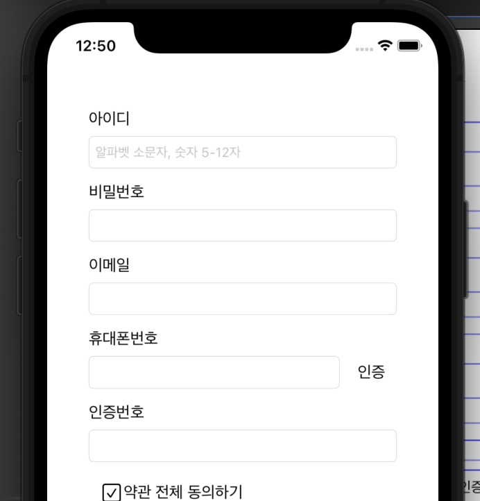 Text Field의 Attributtes Inspector에서 Placeholder를 기본 값으로 "알파벳 소문자, 숫자 5-12자"로 입력해준다