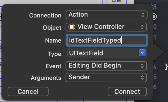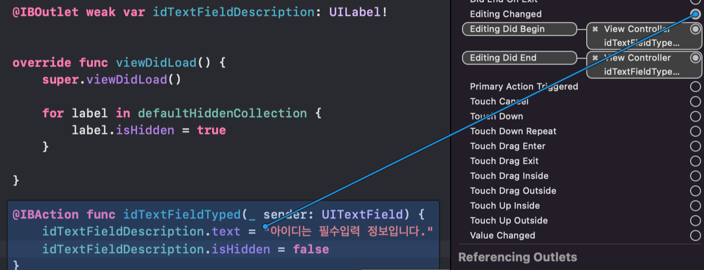 Editing changed 의 오른쪽 O를 클릭한 후 Assistant의 idTextFieldTyped 함수에 드래그 앤 드랍해보자