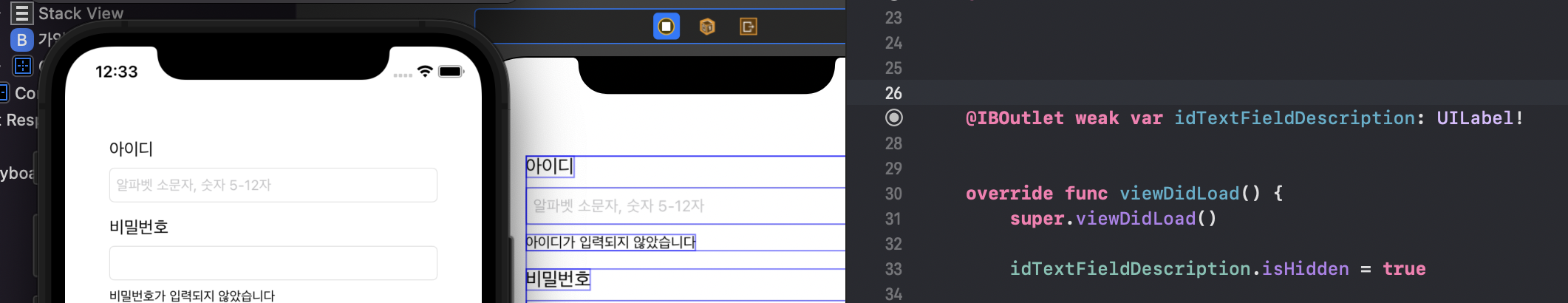실행해보면 "아이디가 입력되지 않았습니다" 라는 label의 공간이 Interface Builder에는 남아있지만 시뮬레이터 상에서는 사라져있는 것을 확인해볼 수 있다