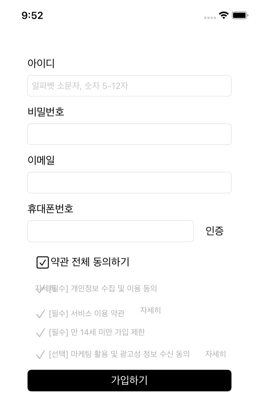 휴대폰 번호는 text field의 값을 계속 받아서 정규표현식(\D)을 통해서 숫자가 아닌 경우를 ""으로 바꾸는 작업을 하고,