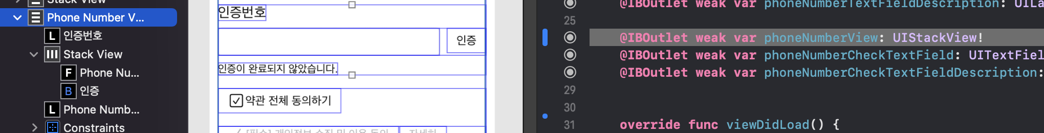 인증 버튼도 Outlet 선언, connect를 해주고 이전에 선언해놓았던 phoneNumberButtonClicked 함수에는 다음 코드를 넣으면 인증버튼을 눌렀을 때 아래 휴대폰번호 인증 Stack View가 나타나고, 버튼 title이 바뀐다