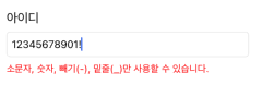 idTextFieldDescription.text = "소문자, 숫자, 빼기(-), 밑줄(_)만 사용할 수 있습니다."