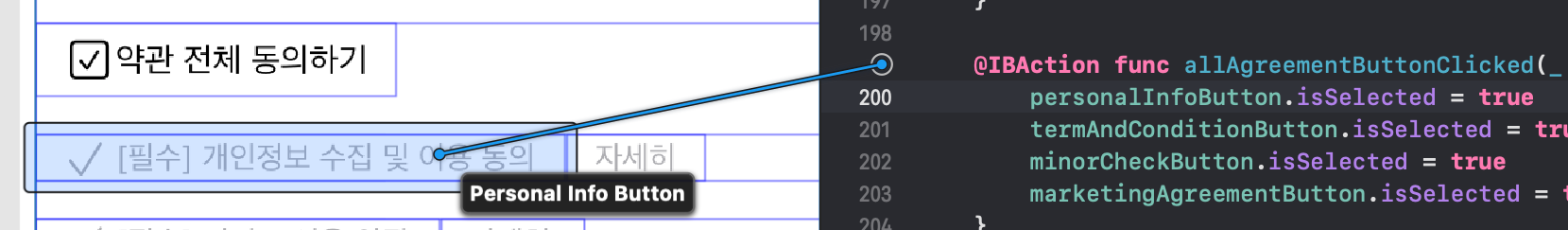 일단 전체동의하기 버튼의 IBAction을 connect 한 다음에, 해당 메서드를 각 버튼들에 연결해준다