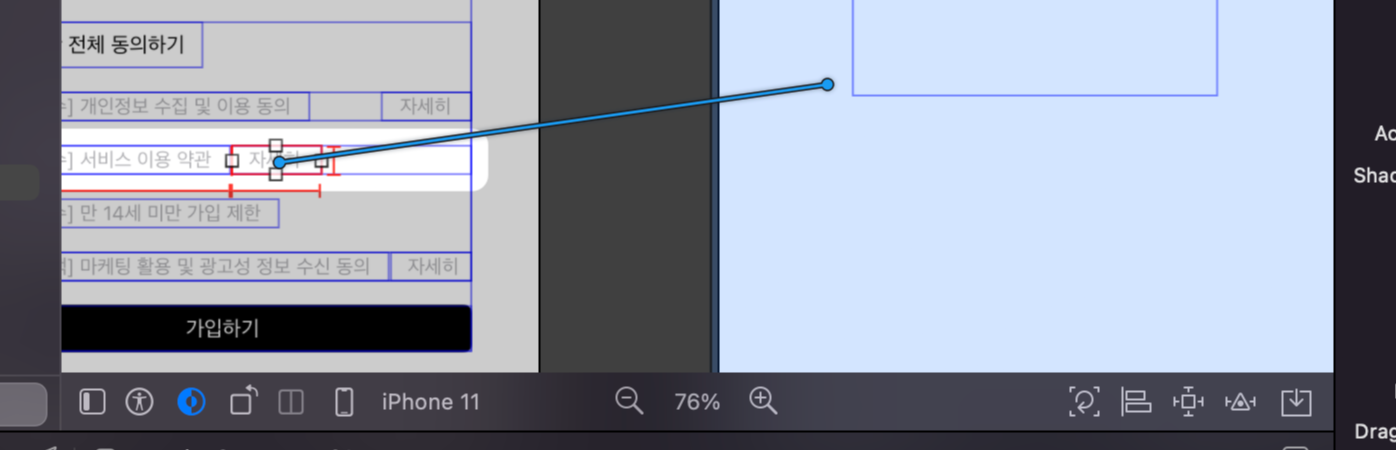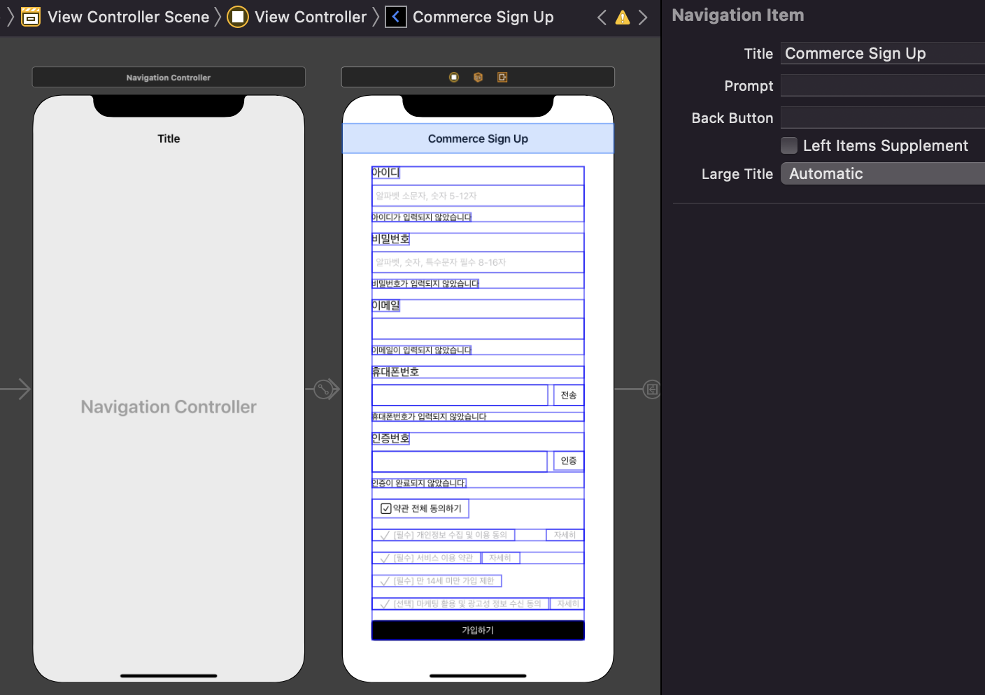 그다음 새로운 view controller의 Navigation 영역에서 title을 스토어 이용 약관 이라고 변경해주었고,
