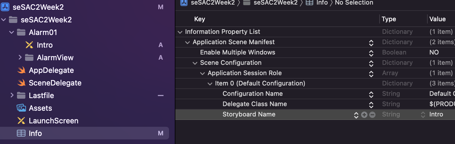 Project Navigator 최하단에 있는 Info.plist파일을 열고 트리를 다 열면 마지막으로 StoryBoard Name이라는 key를 볼 수 있다