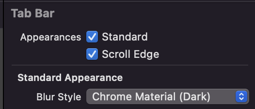 standard appearance 에서는 blur style을 tab bar와 동일하게 Chrome Material (Dark)로 설정해주고, Scroll Edge Appearance에서는 Background를 black으로 설정했다