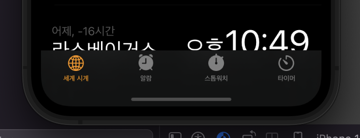 세계 시계라는 title은 컨텐츠를 아래로 당겼을 때 왼쪽에 크게 나타나고(위 이미지의 가운데 Title처럼), 컨텐츠를 위로 스크롤 했을 때는 navigator의 편집과 (+)버튼 사이에 위치하게 된다