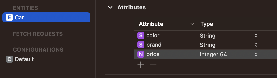 Entity의 이름을 Car로 설정해주고, color, brand, price라는 속성(Attribute)을 설정했습니다.