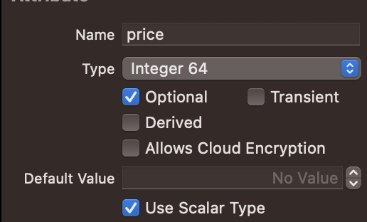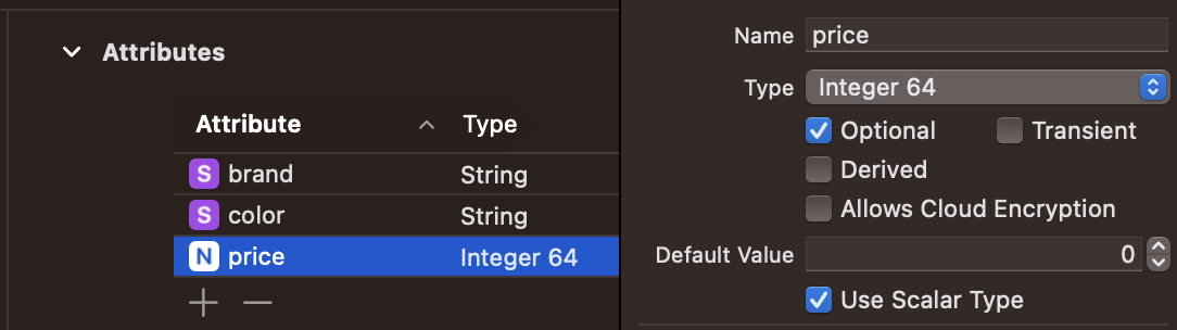 아무런 설정을 하지 않는다면, 현재 String 속성은 optional로, Int64는 non-optional인 것을 알 수 있습니다.