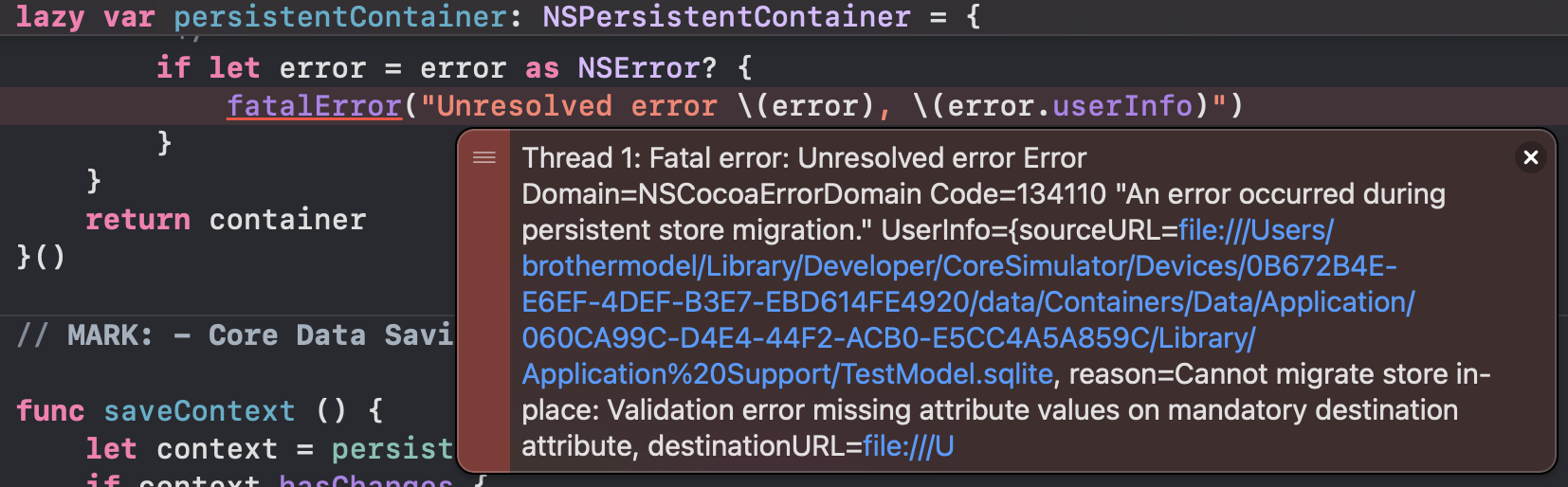 그리고 저장된 데이터들 중에 nil이 있다면, 이후에 속성 값을 non-optional로 설정하면 역시 오류가 발생합니다.
