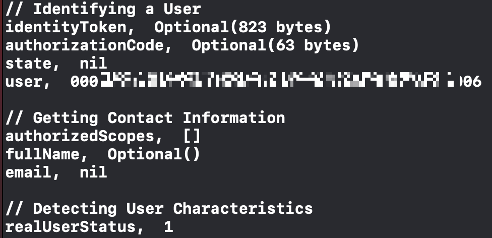 ASAuthorizationControllerDelegate의 didCompleteWithAuthorization 메서드에서 값들을 확인할 수 있습니다.